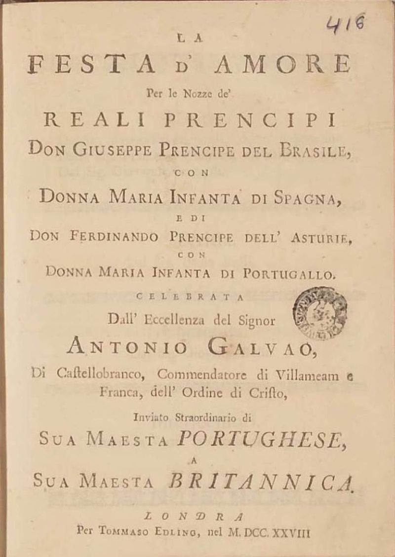 La festa d'amore per le nozze de' Reali Prencipi Don Giuseppe Prencipe del Brasile, con Donna Maria Infanta di Spagna, e di Don Ferdinando Prencipe dell' asturie, con Donna Maria Infanta di Portugallo ...