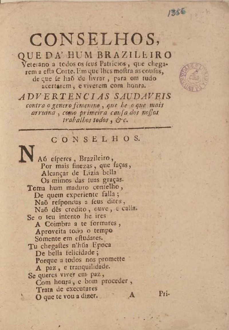 Conselhos, que dá hum Brazileiro veterano a todos os seus Patricios, que chegarem a esta Corte : em que lhes mostra as cousas, de que se haõ de livrar, para em tudo acertarem, e viverem com honra. Advertencias saudaveis contra o genero femenino, que he