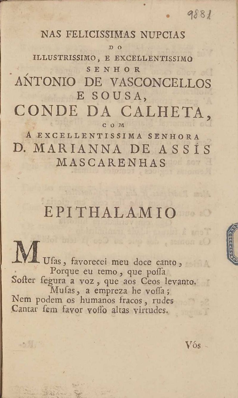 Nas felicíssimas núpcias do Ilustríssimo e Excelentíssimo Senhor António de Vasconcelos e Sousa, Conde da Calheta, com a Excelentíssima Senhora Dona Mariana de Assis Mascarenhas