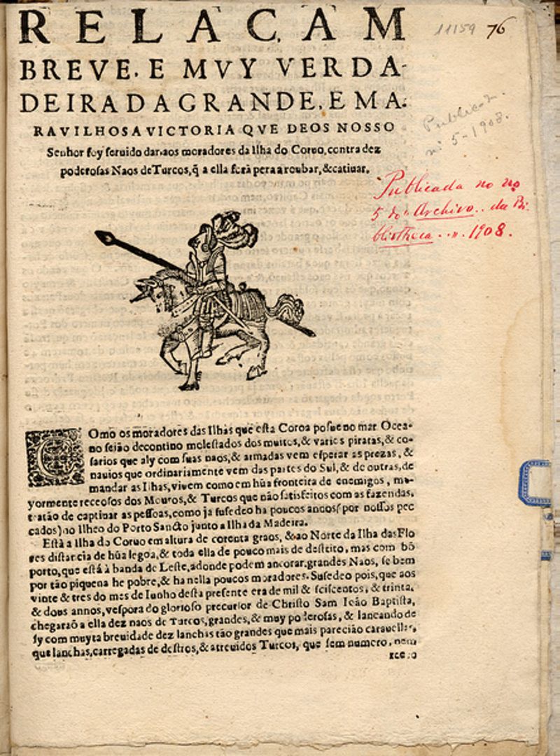 Relação breve, e muito verdadeira da grande, e maravilhosa vitória que Deus Nosso Senhor foi servido dar aos moradores da Ilha do Corvo, contra dez poderosas naus dos Turcos, que a ela foram para a roubar, e cativar