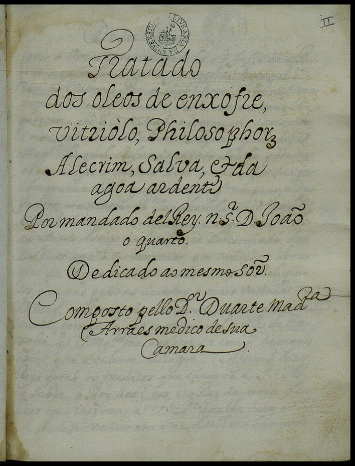 Tratado dos oleos de enxofre, vitriolo, philosophor[um], alecrim, salva, e da agoa ardente, por mandado del Rey N[osso] S[enho]r D[om] João o quarto, dedicado ao mesmo S[enh]or