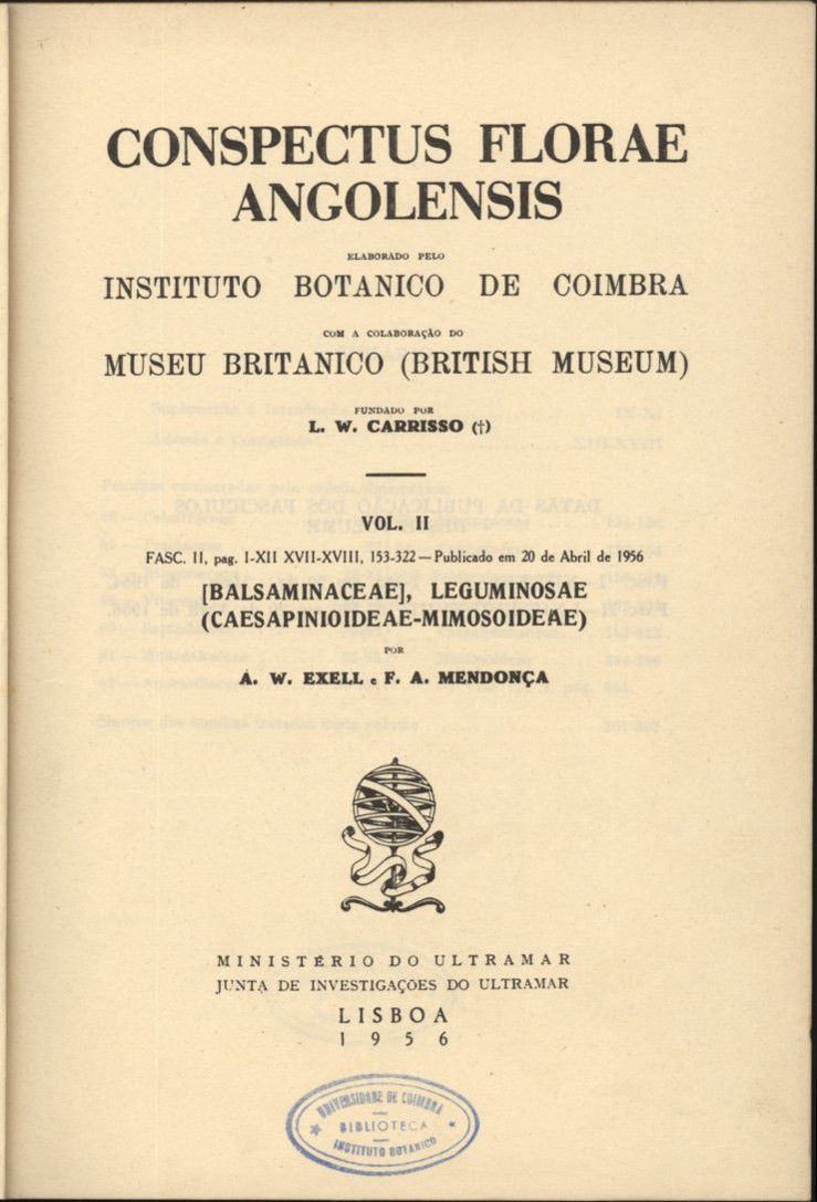Vol. 1, fasc. 1, Ranunculaceae-Malvaceae / por A. W. Exell e F. A. Mendonça. - XXIII, 176 p., [1] f. est. ; Vol. 1, fasc. 2, Malvaceae-Aquifoliaceae. - 1951. - p. 177-422, XXI f. est., [1] f. est. desdobr. ; Vol. 2, fasc. 1, Celastraceae-Connaraceae ; Vol. 2, fasc. 2, Balsaminaceae-Leguminosae : (Caesapinioideae-Mimosoideae) ; Vol. 3, fasc. 1, Leguminosae-Papilionoideae : Genisteae-Galegeae / por A. W. Exell e A. Fernandes ; Vol. 3, fasc. 2, Leguminosae-Papilionoidea: Hedysareae-Sophoreae ; Vol. 4, Rosaceae-Alangiaceae / por A. W. Exell, A. Fernandes e E. J. Mendes ; Pteridophyta / por E. A. C. L. E. Schelpe ; com a colab. de A. C. Jeremy e E. Launert ; Fam. 70, Crassulaceae / por R. B. Fernandes ; Fam. 122, Bignoniaceae / M. Adília Diniz.