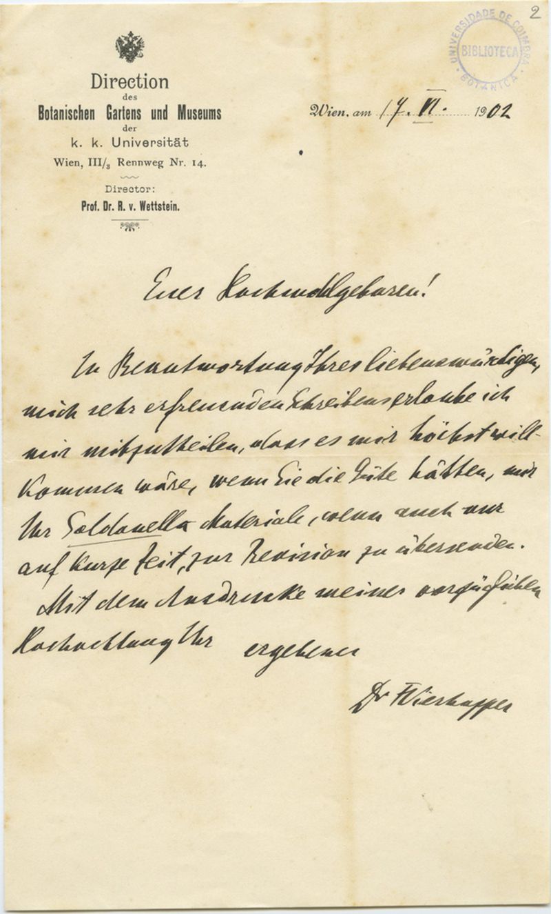 Papel timbrado de: Direction des Botanischen Gartens und Museums der k. k. Universität.