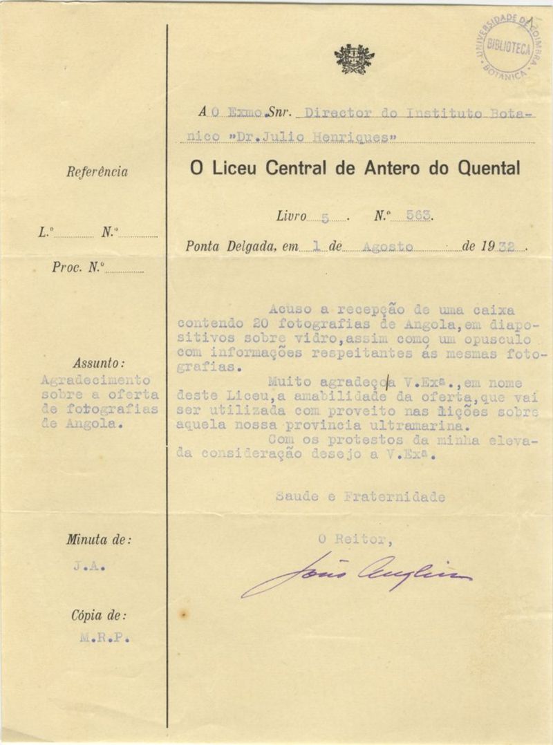 Em papel timbrado de "Liceu Central de Antero do[sic] Quental".