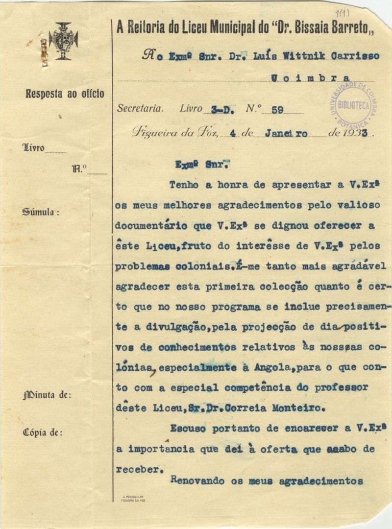 [Carta], 1933 Jan. 04, Figueira da Foz, a Luís Wittnich Carrisso, Coimbra