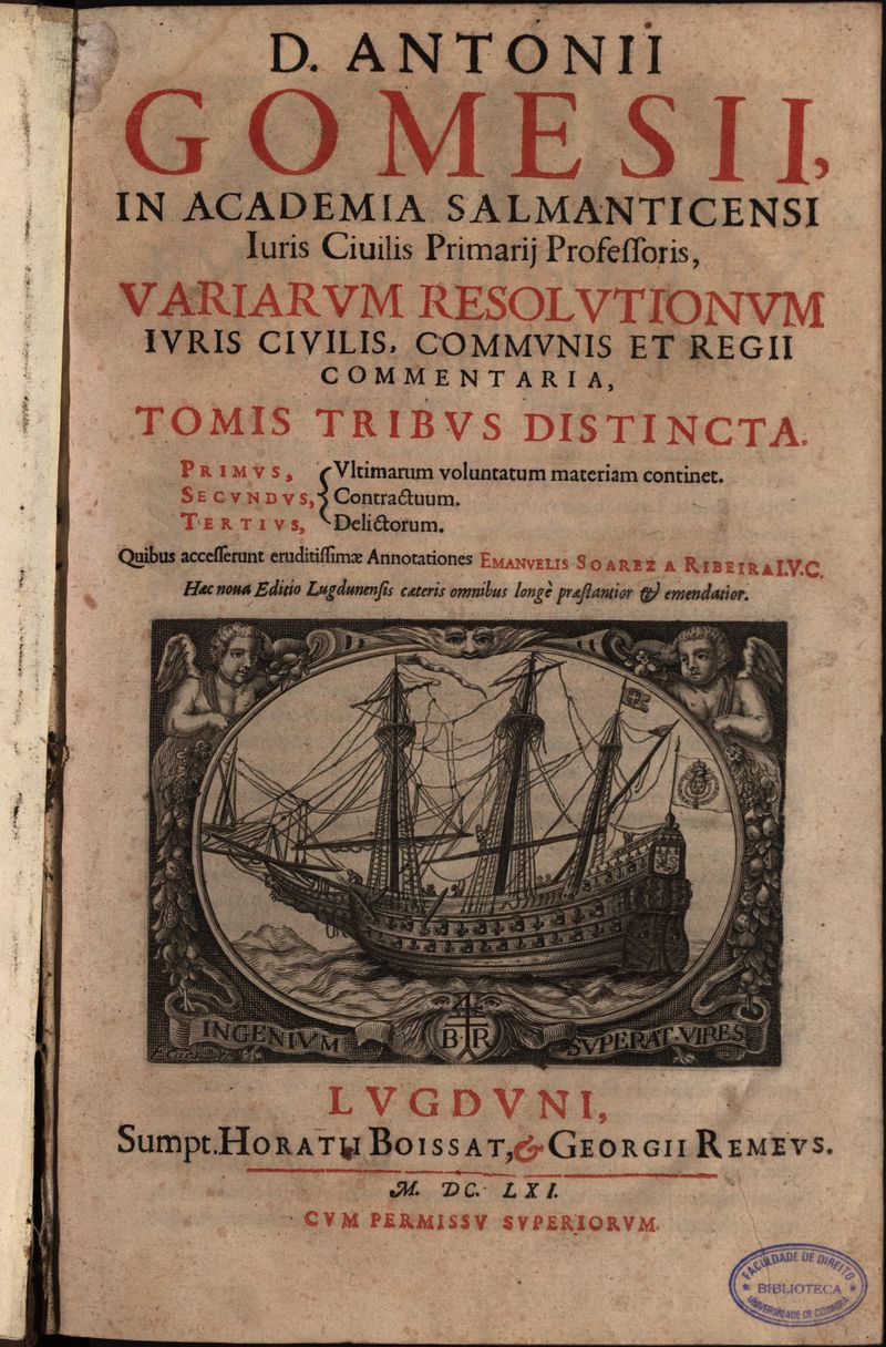 D. Antonii Gomesii ... Opera omnia : duabus partibus distincta quarum prior Ad leges Tauri Commentarium absolutissimum ; posterior vero Variarum Resolutionum tomos tres continet