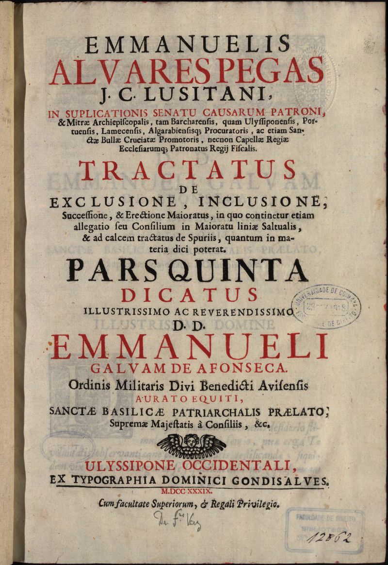 Emmanuelis Alvarez Pegas J. C. Lusitani ... Tractatus de exclusione, inclusione, successione, & erectione maioratus, in tres partes divisas .. - Vol. 5