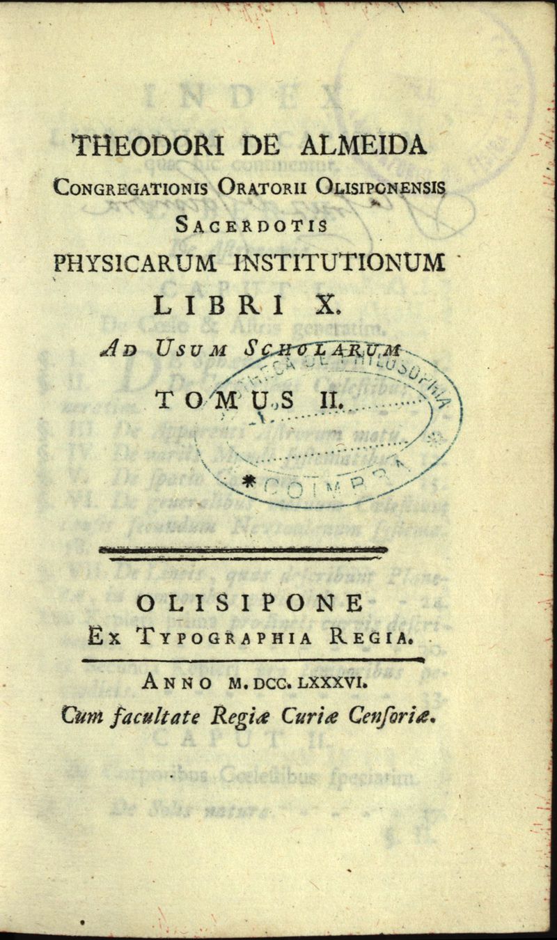 T. I, liber I: De Mechanica. - 1785. - [16], 358 p., 7 folhas de est. desdobr. - T. II, Liber II [-VI]: De Astronomia; De optica, Dioptrica et Catoptrica; De Igne; De Aere; De Aqua et Terra. - 1786. - [8], 404 p. , 8 folhas de est. desdobr. - T. III, liber VII [-X]: De Homine; De Bellus; De Vegetabilibus; X: De Corporibus Vita Carentibus. - 1793. - [8], 311 p. , 2 folhas de est. desdobr.