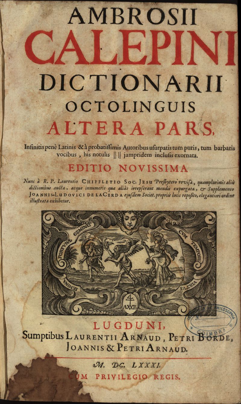 Ambrosii Calepini dictionarium, quanta maxima fide ac diligentia accurate emendatum, & tot recèns accessionibus ita locupletatum, ut jam Thesaurum linguae Latinae quilibet polliceri sibi audeat. Adjectae sunt latinis dictionibus Hebraeae, Graecae, Gallicae, Italicae, Germanicae, Hispanicae, atque Anglicae. Item notae, quibus longae, aut breves syllabae dignoscantur. Praeter alia omnia, quae in hunc usque diem fuereunt addita, praecipuè à Joanne Passeratio, ..