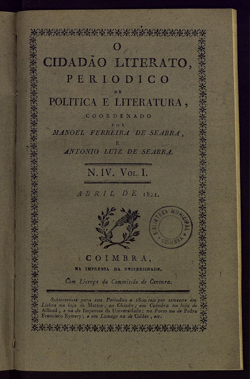 Lisboa : na Nova Impressão da Viúva Neves e Filhos ; Coimbra : na Imprensa da Universidade, 1821
