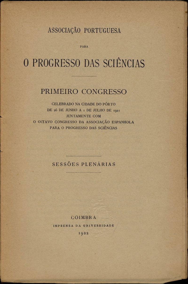 Primeiro Congresso [da] Associação Portuguesa para o progresso das Sciências : celebrado na cidade do Porto de 26 de Junho a 1 de Julho de 1921 juntamente com o oitavo congresso da Associação Espanhola para o Progresso das Sciências : Sessões de ma