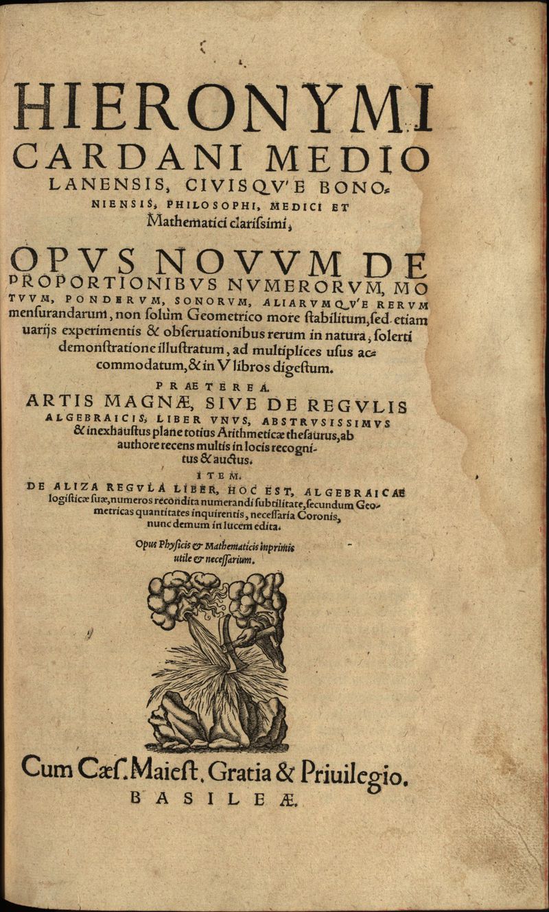 Hieronymi Cardani ... Opus novum De proportionibus numerorum, motuum, ponderum, sonorum, aliarumque rerum mensurandarum, non solùm geometrico more stabilitum, sed etiam varijs experimentis & observationibus rerum in natura, solerti demonstratione illustratum, ad multiplices usus accommodatum, & in V libros digestum. Praeterea Artis magnae; sive De regulis algebraicis, liber unus, abstrusissimus & inexhaustus plane totius arithmeticae thesaurus, ab authore recens multis in locis recognitus & auctus. Item De Aliza regula liber, hoc est, algebraicae logisticae suae, numeros recondita numerandi subtilitate, secundum geometricas quantitates inquirentis, necessaria coronis, nunc demum in lucem edita..