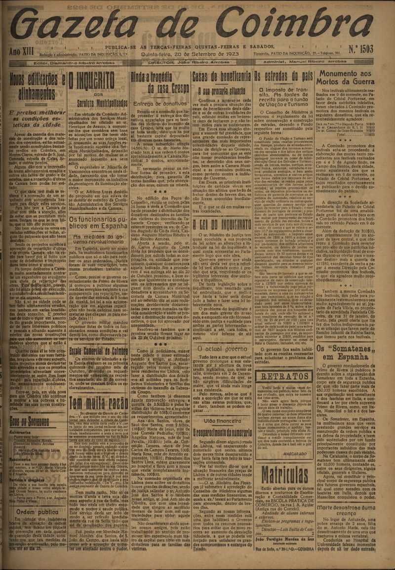 Gazeta de Coimbra 1923, Setembro 20, quinta-feira - Nº1503