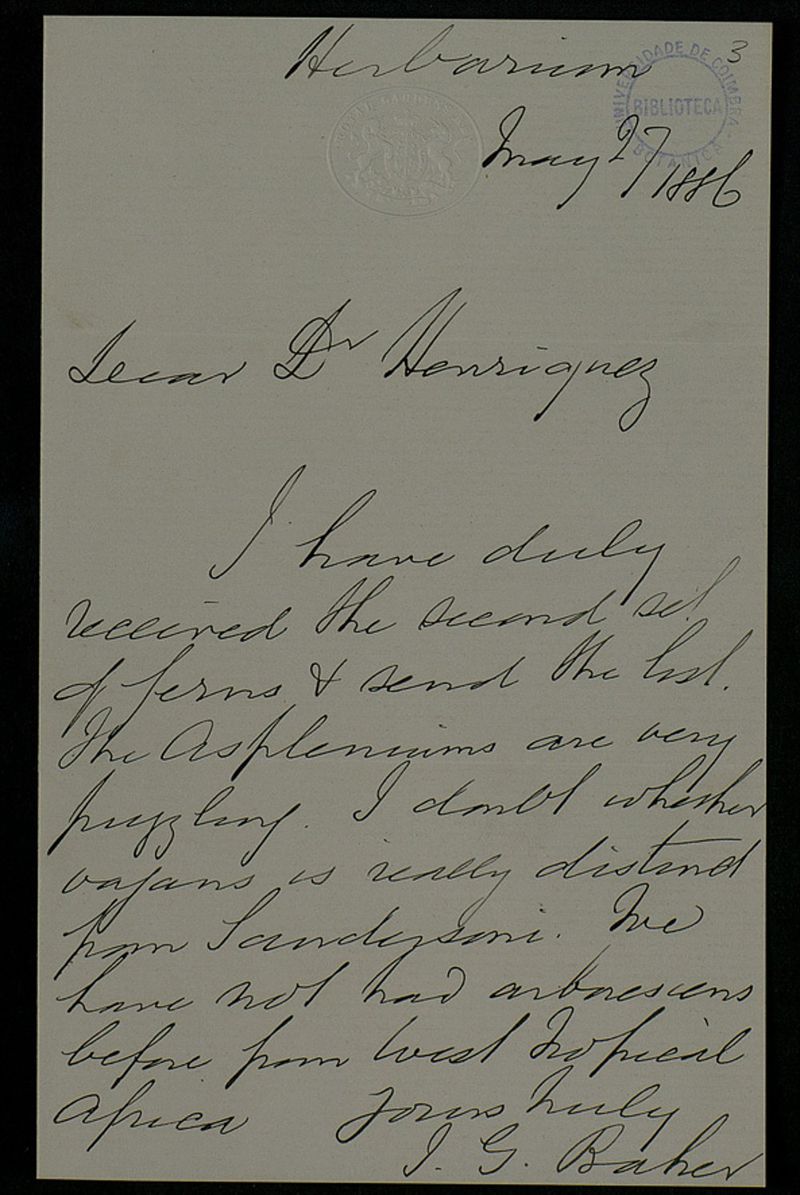 [Letter], 1886 May 27, Kew, [to] Dr. [Júlio] Henriques, [Coimbra]