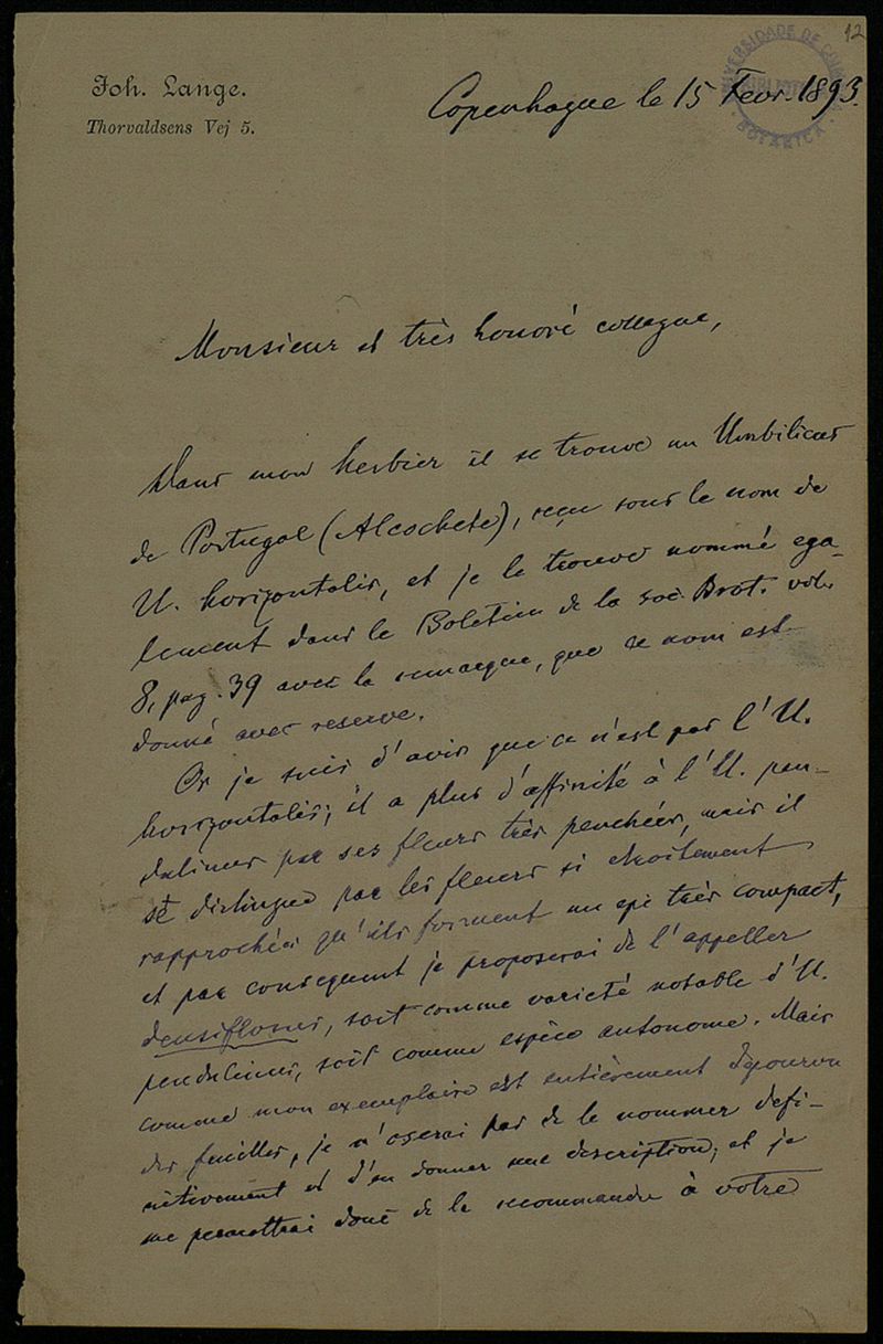 [Lettre], 1893 fév. 15, Copenhague, [à] Monsieur [Júlio Henriques], Coimbra