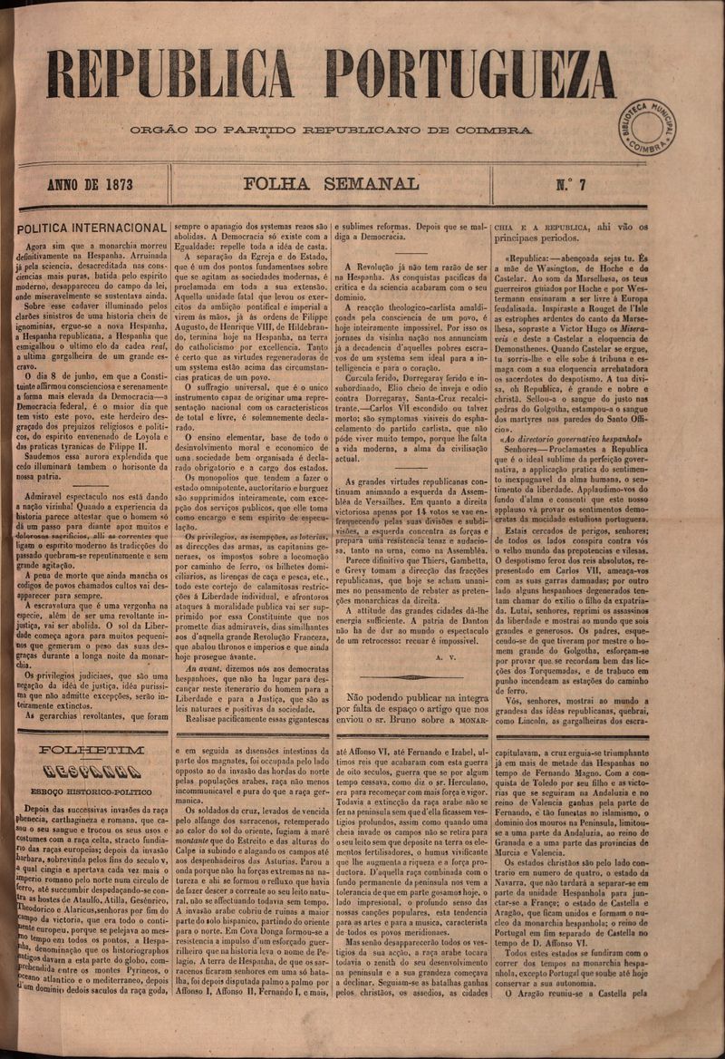 Republica Portugueza : folha semanal - 1873, Junho 04, quarta-feira - Nº7