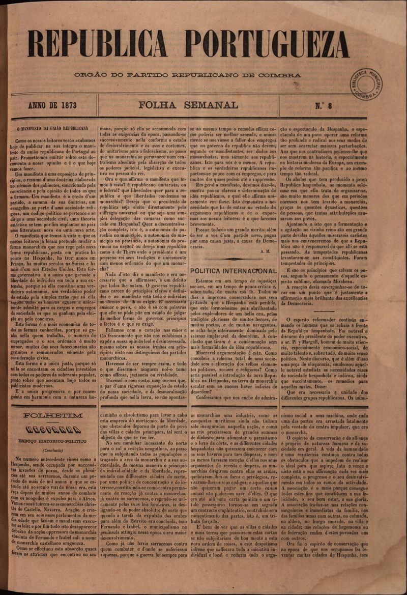 Republica Portugueza : folha semanal - 1873, Junho 09, segunda-feira - Nº8