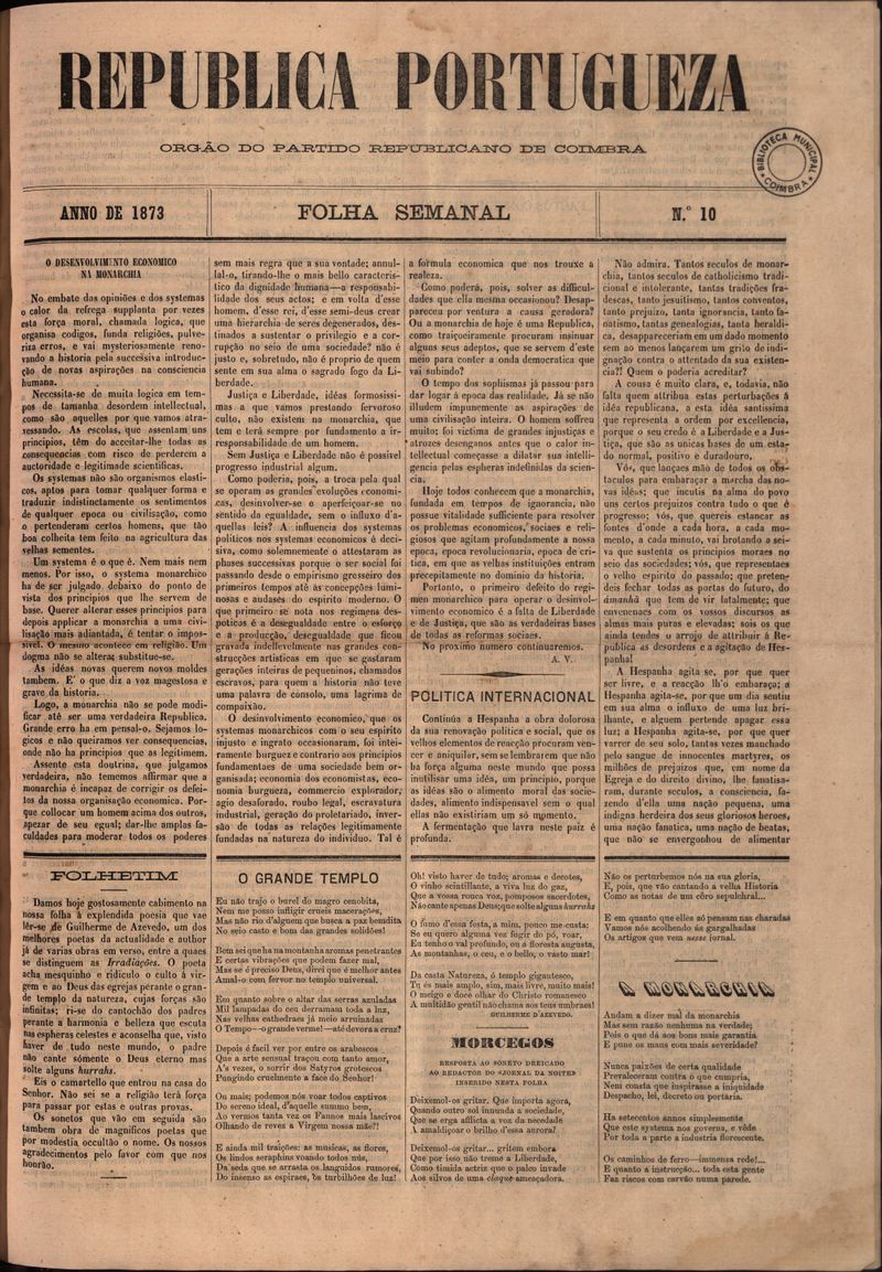 Republica Portugueza : folha semanal - 1873, Junho 25, quarta-feira - Nº10