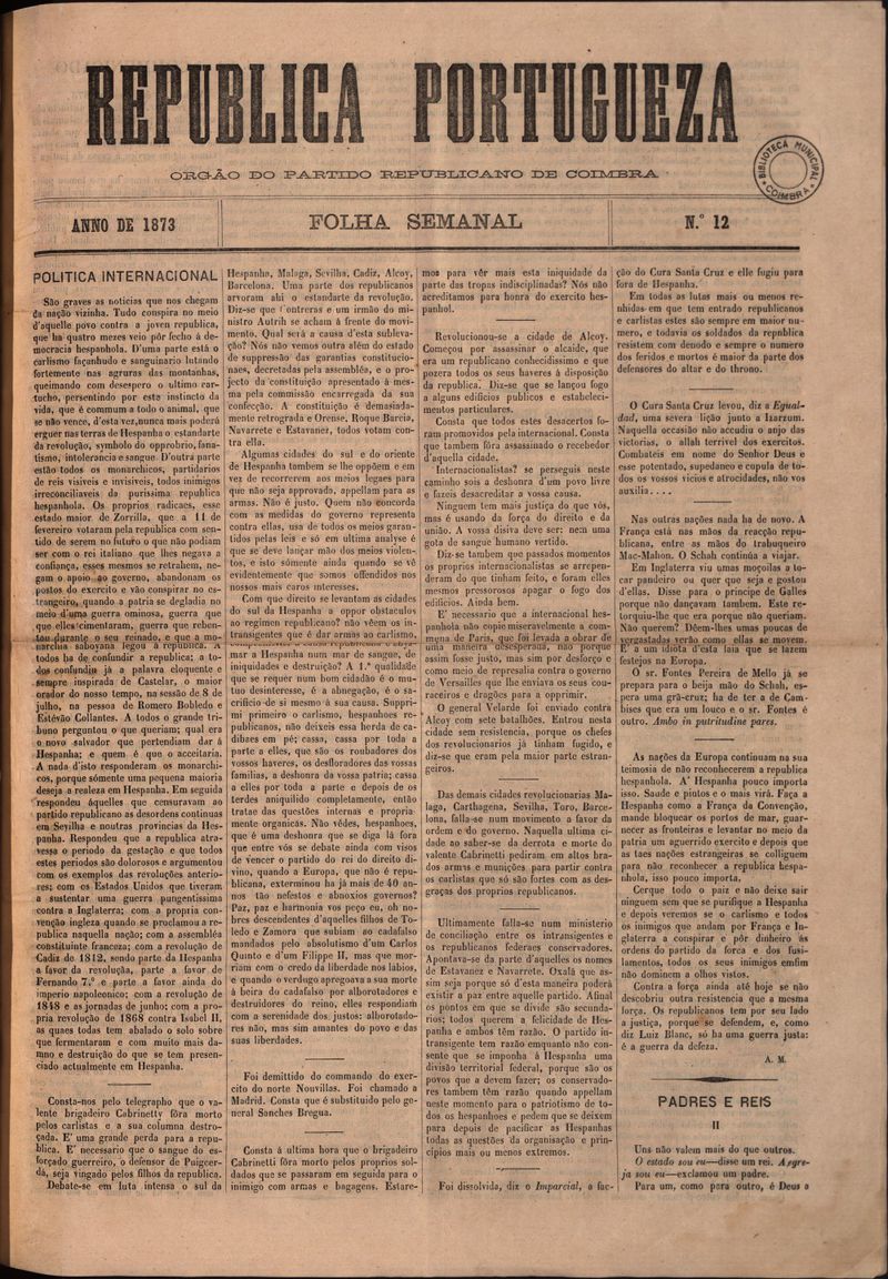 Republica Portugueza : folha semanal - 1873, Julho 04, sexta-feira - Nº12