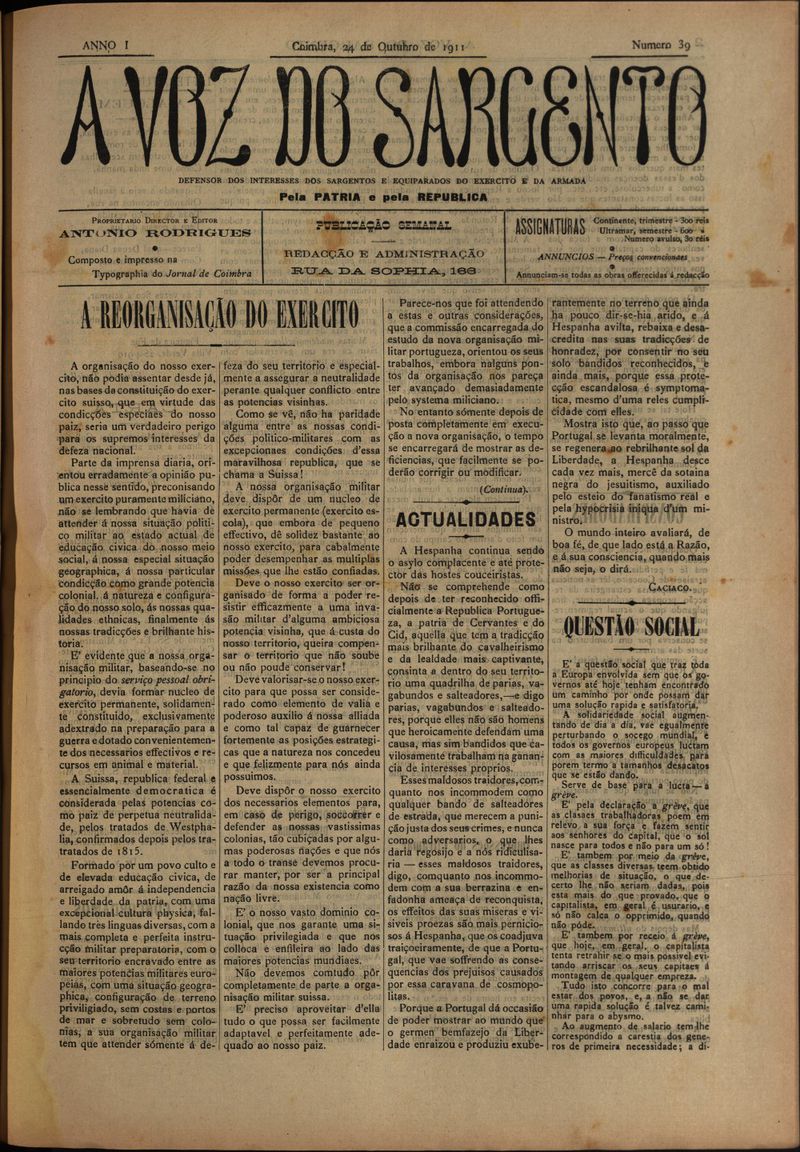 A voz do sargento : defensor dos interesses dos sargentos e equiparados do exército e armada - Nº39