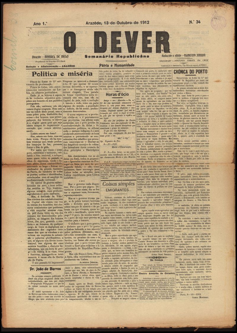 O dever : semanário republicano 1912-10-13